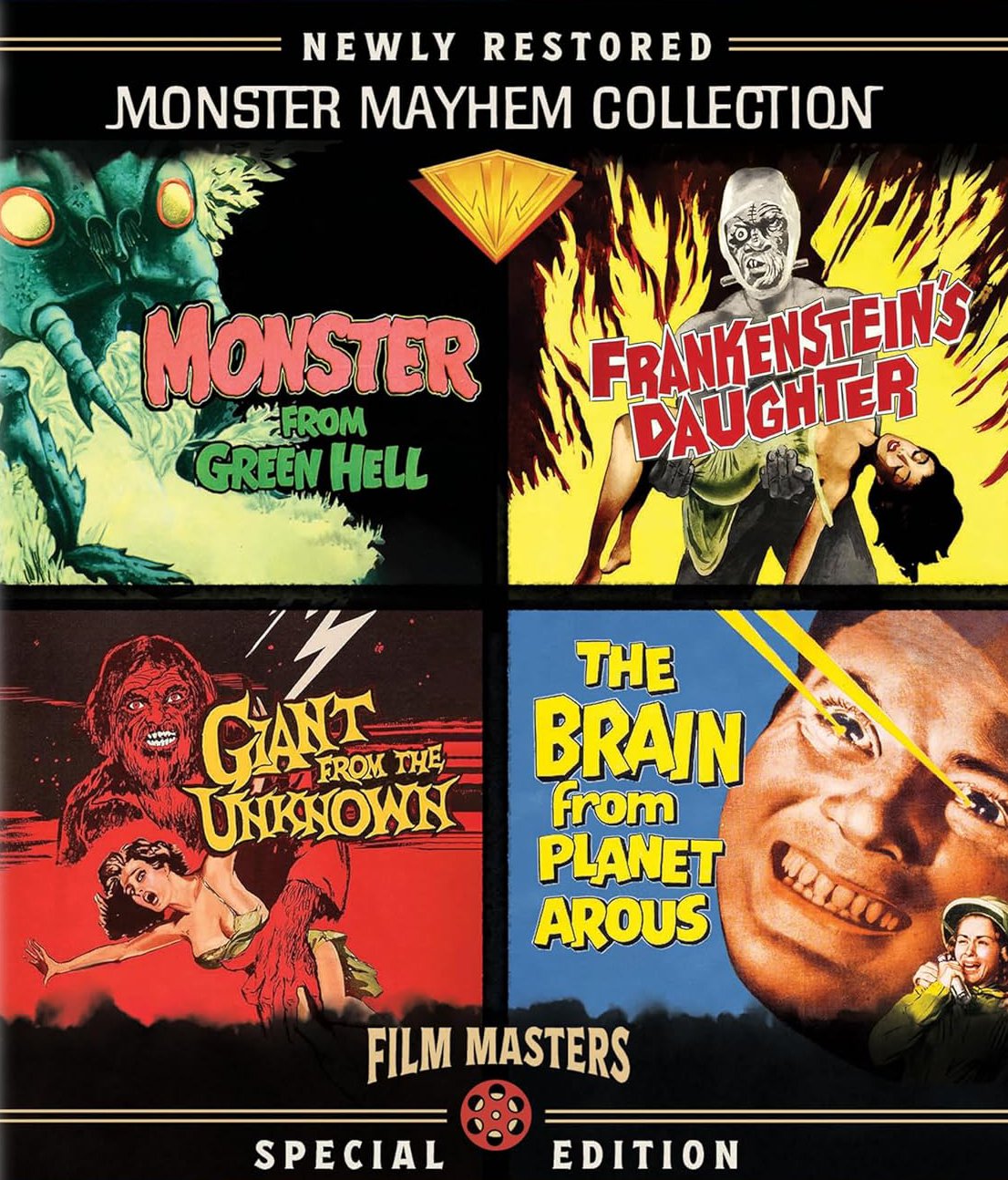 When I saw this Monster Mayhem Collection announced, I was pretty excited. Then when I saw it was coming from Film Masters, it made it even better. Releasing 4 great titles from the 1950s, one of my favorite eras, means it’s always going to be a fun time. In this set, you get Kenneth G. Crane’s Monster from Green Hell and Nathan Juran’s The Brain from Planet Arous, both from 1957, and then two features from director Richard E. Cunha, Frankenstein’s Daughter and Giant from the Unknown, both from 1958. Each of the titles have 4K scans from archival prints in their original theatrical aspect ratios. While Brain looks a little bright, it still looks good, while the other ones all look crisp and clean, the usual high-quality standard we’ve seen from previous Film Masters’ releases.