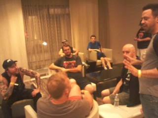 During the afterhours part at any of these conventions, it is not a common thing to see a bunch of us horror nerds gathered around in the lobby or bar area, or anywhere there is a place to sit/stand (and lay down for some of us) and just talk movies. We’ve been known to do this until the wee hours of the mornings before, jumping from one movie to another, each of us giving our thoughts and opinion. Most of us usually go away from these with at least a couple of movies that we need to add to our To Watch List. Well, Saturday night, a bunch of us were doing just that, when a gentleman (wearing a kilt no less) walked by and ask if we were talking about movies and if he could join in the group. Of course, there is no exclusion here, since all horror fans are welcome to put in their two cents worth. We found out that he had flown all the way out here from San Francisco for this show. Before we knew it, it was well after 3am when we finally decided that getting a few hours of sleep before the show opened on Sunday might be a smart idea. (Above Photo Credit: Bryan Schuessler).