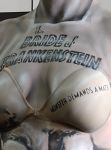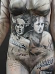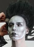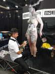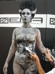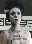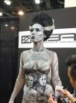 While Scott and I were walking around on Sunday, we stopped by a body paint job that was going on. What stopped us was the face of the model was made up like Elsa Lanchester from The Bride of Frankenstein, but in black and white. The likeness was absolutely stunning and spot on. The model said that she looks nothing like Lanchester and that was all from the paint. The man behind the airbrush was Nix Herrera. But it didn’t stop with her face. When we first stopped, he had sprayed some stencils on her chest and stomach of the movie title and the characters of the Bride and Dr. Frankenstein. We were entranced, seeing this transformation taking place in front of us. So we stood there. Taking pictures and watching Nix work. Granted, it probably did seem a little creepy for the model wearing very little, having these two guys standing 6 feet away with their phones out taking a picture every time he added another detail. Lucky for us, we weren’t the only ones standing there, gazing at this. I also felt so sorry for the model because she was freezing. Wearing nothing but some tiny underwear and her breasts covered up, she was otherwise naked. You could see her teeth chattering and the goosebumps on her arm as he sprayed her. But she is obviously a professional and worked through it. Got to give her kudos for that!