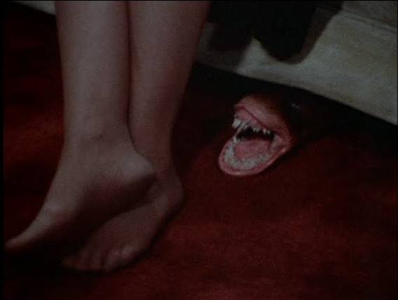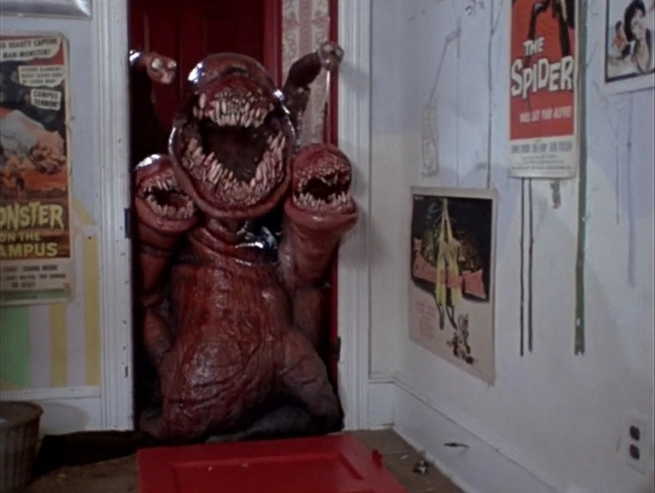 Being a monster fan, when you see a creature like nothing you’ve ever seen before, that is always a highlight, and this film does that in bloody spades. I mean, we’re talking about an monster that is pretty much just mouths and teeth!!! Not only did Dods come up with this unique design, he brought it to life with very little money, and being very creative in how it was going to look and move onscreen. To the simple but highly effective way he made the little spawns sliding through the watery basement, to some great creative camera shots, like the ‘monster-mouth cam’ where we see the potential victim through the monsters mouth with all those teeth munching down, it really is something special. It appeases the gore-hounds with the amount of carnages and bloody attacks it does, as well as it’s little slimy offspring, especially when they attack a little get-together with some of the neighborhood ladies.
