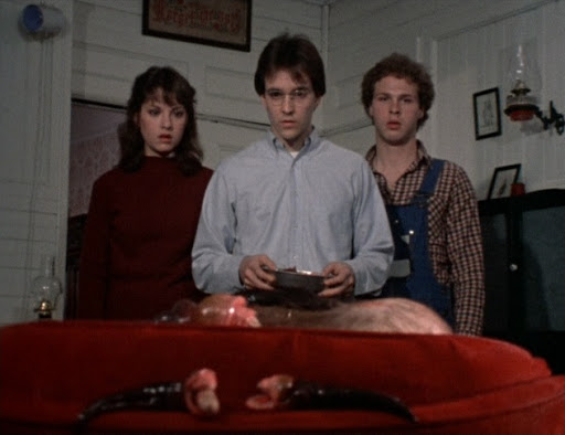 The story starts with a meteor crashing to earth near this little small town, releasing these little aliens beasties, looking like large slugs with bigger teeth, that nest in the basement of a nearby house. Anybody that goes down into the basement becomes a tasty little meal for these inter-galactic eating machine that seems to be growing. The two boys that live there, one a 10-year old monster movie fan, and his older brother who is a science major in college, join up with their friends in an attempt to take on this creature that is devouring their family, before it takes over the whole town!