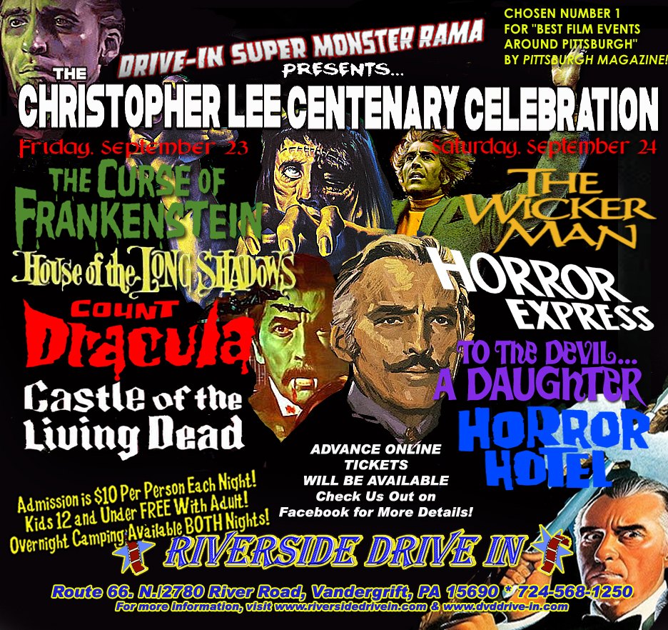 Sept. 23rd & 24th – The Drive-In Super Monster-Rama at the Riverside Drive-In in Vandergrift, PA: The have announced the final lineup for this fall’s movie marathon, and if you’re a fan of Christopher Lee, this is one you won’t want to miss. They are doing a Christopher Lee Centenary Celebration. They will be screening 8 different Lee films over two nights, and they have one hell of a lineup there. See their lineup below. For all information about this event, check out their Facebook page HERE.