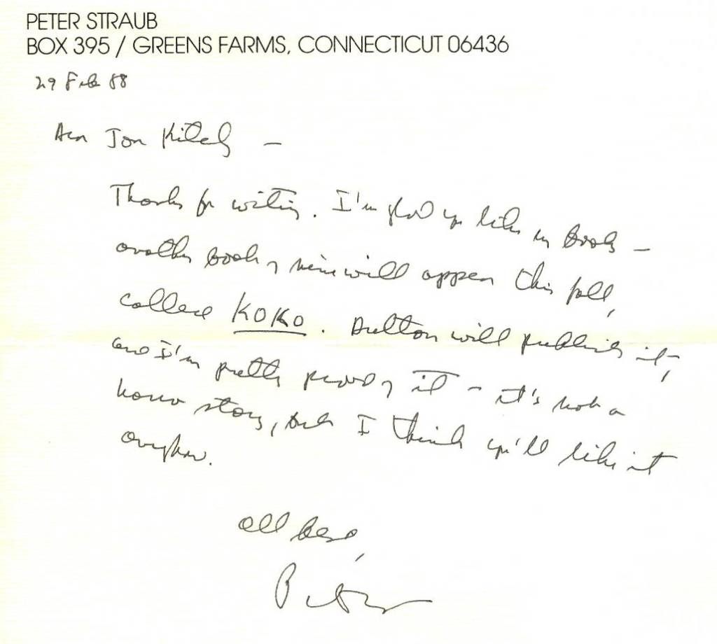 So it is with sadness that I mention that Mr. Straub has passed away, at the age of 79. I remember either reading or seeing an interview with Stephen King, where he mentioned that Straub hand wrote all of his work, and that he didn’t feel sorry for anyone more than Straub’s editor because his handwriting was damn near illegible. In the late ’80s, when I was reading a lot of fiction, I would often write to authors, many times getting a letter back. When I got one back from Straub, I realized how right King was. I’ve posted the letter below.