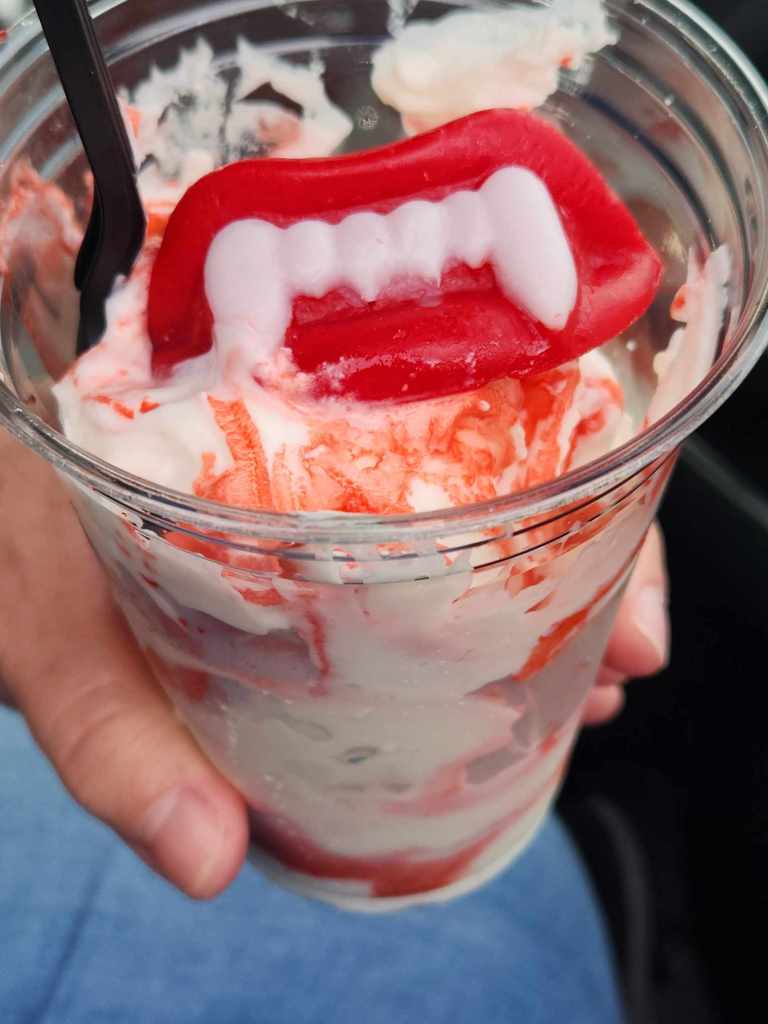 Why do we drive that long to stay up all night to watch movies that not only have we seen already, but own in our personal collection? Because for the experience. It really is as simple as that. Going to the drive-in for these types of events are just a lot of fun. You’re surrounded by a ton of like-minded people, vendors selling some interesting items, not to mention all the treats at the snack bar, that the Skyline usually puts a horror spin on some of the items to make it even more fun! Like the Dracula’s Bite ice cream sundae, which included some wax vampire teeth!
