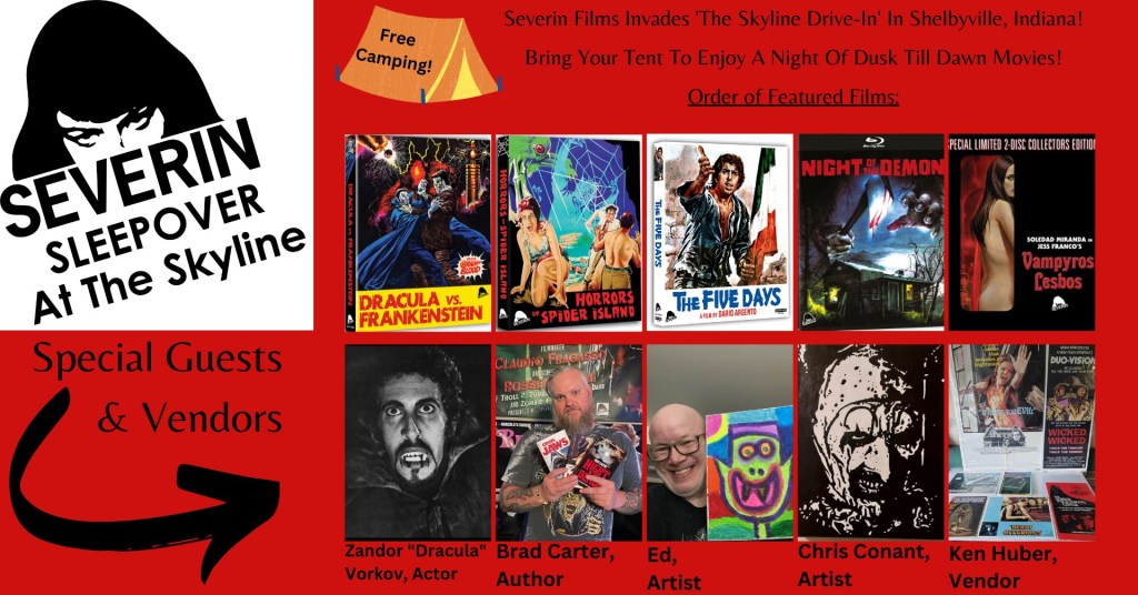 On September 9th, the Skyline will be hosting the Severin Sleepover that I mentioned earlier, screening Al Adamson’s monster epic Dracula vs Frankenstsein (1971), with Dracula himself, Zandor Vorkov appearing to greet the fans, as well as Horrors of Spider Island (1960), Dario Argento’s rare comedy The Five Days (1973), Night of the Demon (1980, and Jess Franco’s Vampyros Lesbos (1971). Severin will have a table there, as well as some other guests and vendors. For more info, just click HERE for the events page.