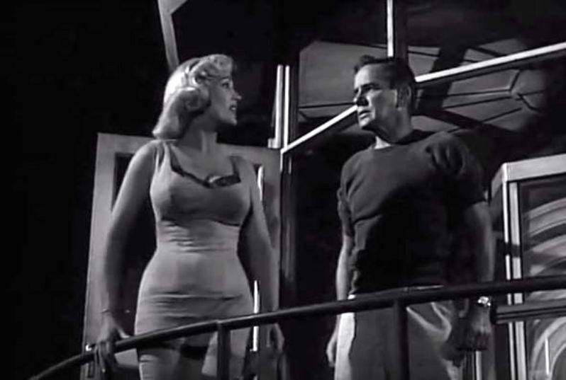 Richard Carlson plays Tom Stewart, a jazz pianist who will be marrying a young (and rich) woman named Meg. The problem is when an old girlfriend of Tom’s shows up on the island resort they are all staying at, demanding he break off the marriage and stay with her. Tom takes Vi, the girlfriend, to a nearby lighthouse, so they can talk. He does his best to tell her that it’s over between them, but Vi won’t have any of it. When she threatens him with blackmail, saying she’ll turn over all his love letters to his fiancée, that is when we start to see a different size of Tom come out. At first, he seemed like he was upfront with Vi, but after the blackmail remark, his expression shows a darker side of him. While at the top of the lighthouse, the railing gives way and Vi starts to fall but catches the railing, hanging there. She calls for Tom to help her, but he stands there, staring. He starts to reach out but then quickly pulls his hand back. Then suddenly, she drops.
