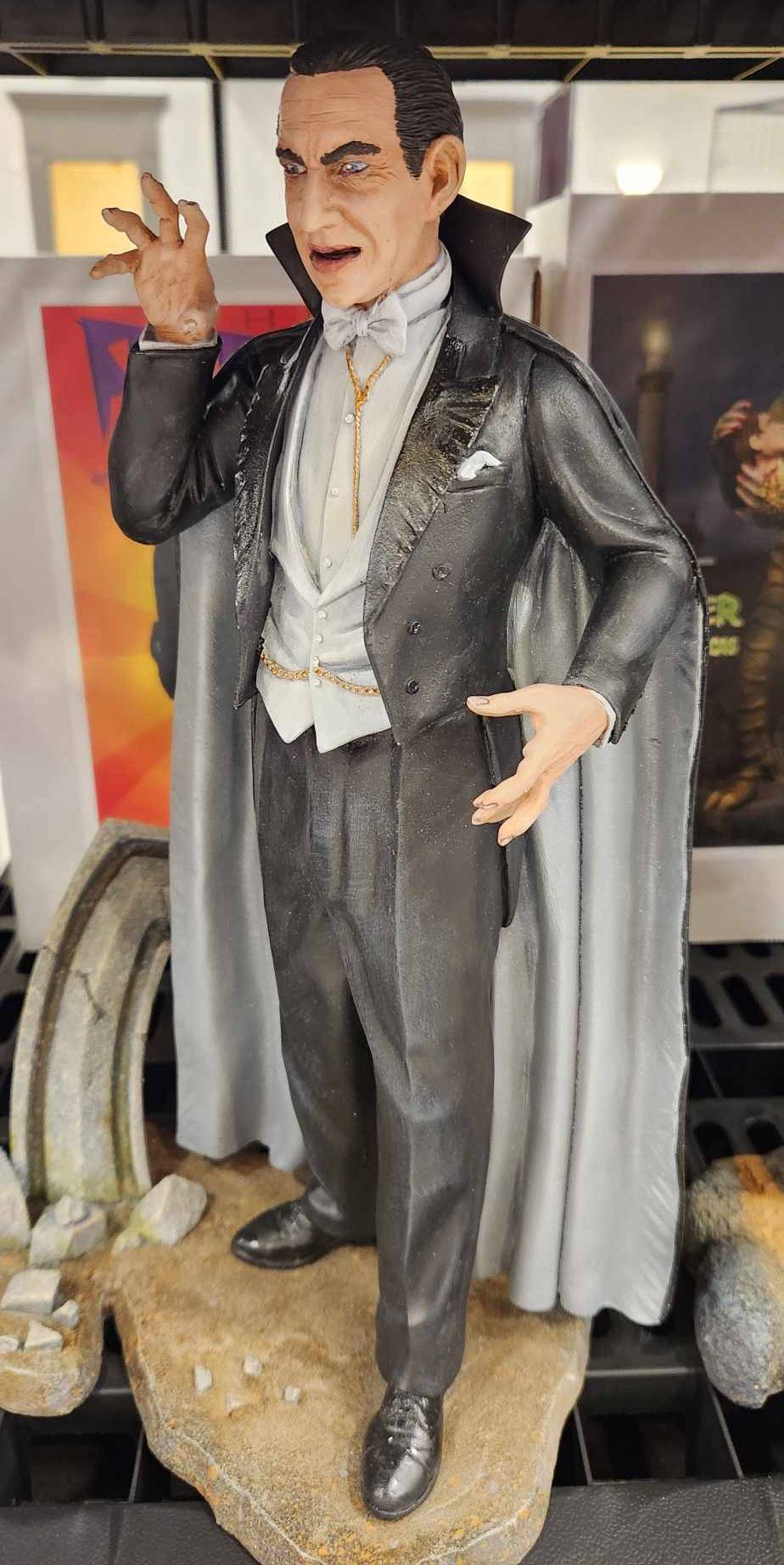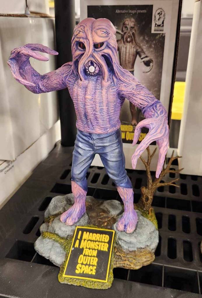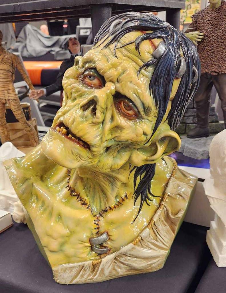 Scott Kelley, who runs Alternative Images, is a vendor dealing in model kits, that he not only builds but paints as well. I met him at Monster Bash a few years ago and ended up buying a couple of kits from him, namely a full-sized Beast of Blood kit that was basically the art from the poster but in a kit. Beautifully painted, I knew when I saw it, I was going to have to take it home. He mentioned even then that he had an idea for making a life-size kit of the beast’s head, being held up by its hands. I told him right there that I would be his first customer. Flash forward to this last Friday, when I saw him setting up, and sitting on the top shelf was the kit. When I walked over to get a closer look, I couldn’t believe the job he had done, and promptly told him so. He said thanks, smiled, and pointed behind his table saying, “I’ve got yours already packed up and ready to go.” It wasn’t even a question on if I was going to get it. Of course I had to get it! And now, as I write this out, it is staring down at me from the top of one of my bookcases. Talk about inspiring!