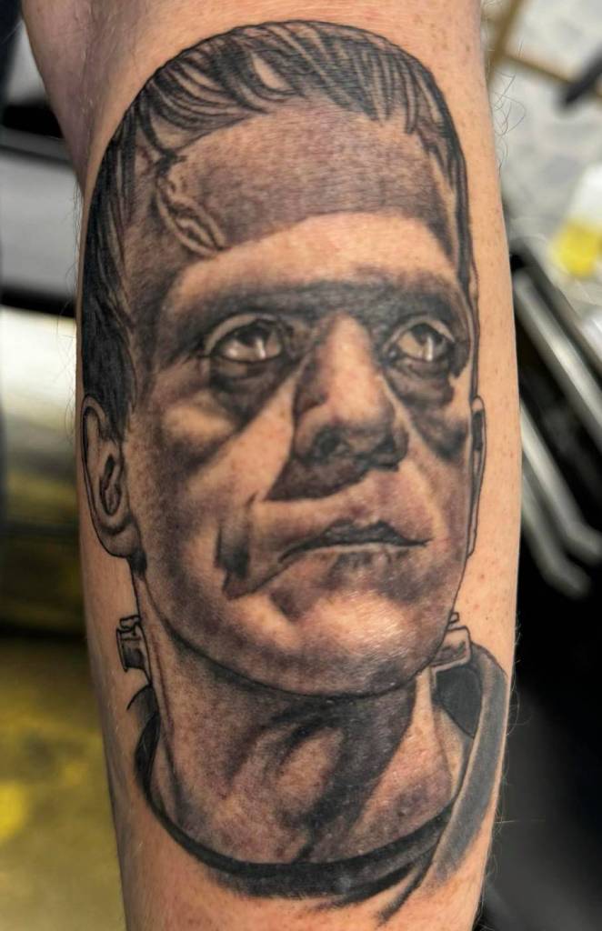 I knew for some time that I wanted to get a nice piece from Frankenstein (1931), of the creature, since it remains one of my favorites, but also means a lot to me on a more personal level. I picked the shot where the ceiling door was opening, and the creature starts to look up at this light coming from above him. Not only was it one that I hadn’t seen all over the place in tattoo form, but in a moment of reflection, I felt that it showed the creature looking up towards the light. Meaning that no matter what your situation, no matter how dark things might be, there is always a brighter side to it. Pretty deep, huh?