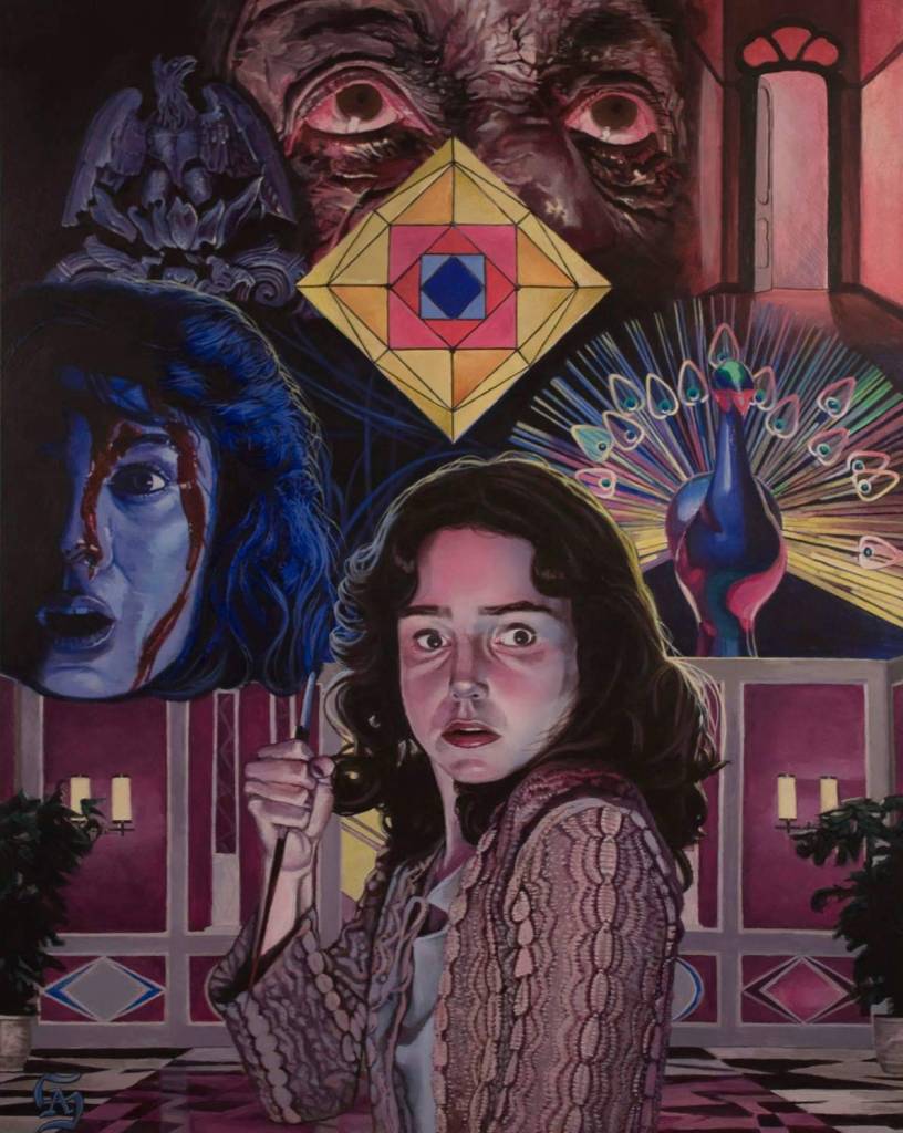 Then at a local movie marathon, I met artist Aaron Stockwell, whose paintings just blew me away. It was his piece from Lamberto Bava’s Demons (1985), of a closeup of the shiny mask from the film that I just couldn’t believe he did with paint. It really looked like metal, with the shine and reflections. Just incredible piece of work. Over the years, his work has impressed me more and more. In fact, at one show where he was set up, I ended up buying this original piece from him, Dario Argento’s Suspiria, which is still hanging in my office.
