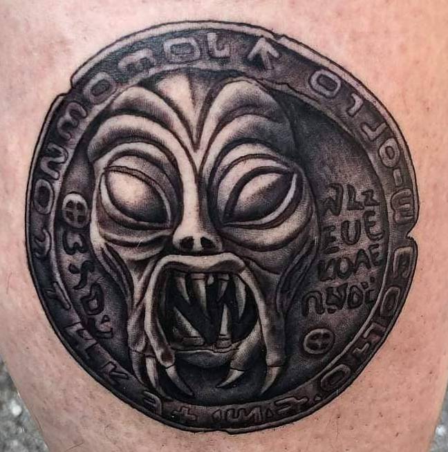 At some point, I discovered that Aaron is also a tattoo artist, and knowing how amazing his painting is, I knew that when it was time for another tattoo, Aaron would be the guy. It seems that every time I would have the money set aside, some other issue would arise, like furnace issues, car repairs, or any other number of normal things that life throws at you, so there went the money. But then 2020, the stars aligned, and I had Aaron recreate the medallion from Mariano Baino’s Dark Waters (1993) on my calf. Again, even with all the details of the artwork, Aaron pulled off.