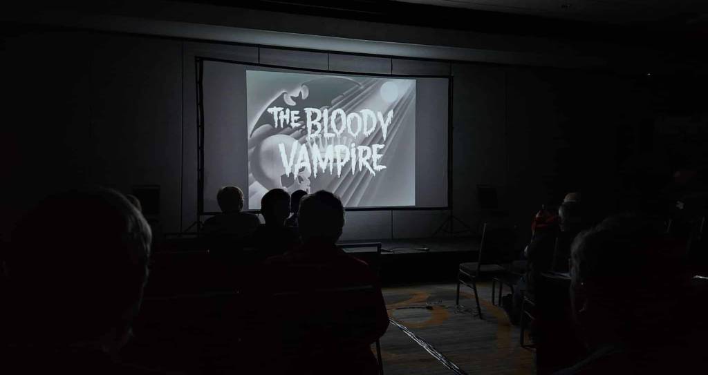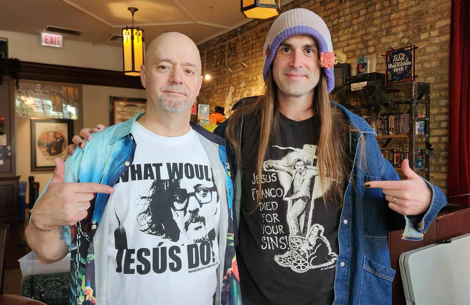 While we were setting up, I was sporting my Jess Franco shirt that indie director Tim Ritter had given me at Wasteland, only to see Will Morris, the programmer for the marathon, sporting our Franco shirt that we had made. And we all know, every day is “Jess Franco Day” to some people!