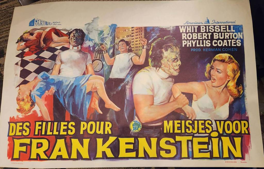 We’ve been doing this show coming up on 10 years in a row now and have always come home with a few cool pieces. There might be a table full of $10 half-sheets, or 8×10 stills for $1 each, that you’ll have to dig through to find something you’re interested in. Then the table next over might have lobby cards that run $500 to $1000 per card, so it really runs the gambit on collectibles and prices. Sometimes the real joy is not finding what you’re looking for but finding something cool that you weren’t expecting to even see! There was a dealer with a couple of tables with tons of half sheets piled up there, all $10 each. I only dug through a small section but found one for the 1961 film Bloodlust starring Robert Reed, which is a variation of The Most Dangerous Game. Not in perfect shape but again, only $10! And who would have thought I would have stumbled across that one! Also found this incredible looking Belgium poster for one of my childhood favorites (and still is), I Was a Teenage Frankenstein (1957). That was a little more than $10, but still worth the money.