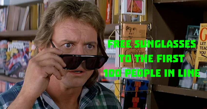 For those that get there early, we’ll be handing out free sunglasses to the first 100 people in line to get in! Now, we’re not saying that you need to wear these glasses to see what is really going on, but one never knows…. Right before the gates open, we will be out there passing the sunglasses and maybe even some eye patches (in case you’re more Snake Plissken fan than Roddy Piper!) to those in line until supplies last. In other words, make sure you get there early!